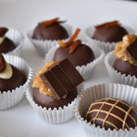 - To garnish truffle, place a small amount of topping onto the top of the truffles. Add a small chocolate square if desired.