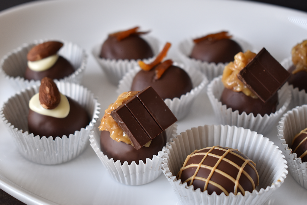 For the flavors I decided on an almond truffle, an orange truffle, a German chocolate truffle, and a peanut butter truffle. I made small changes to each truffle filling so that they could be easily made from the same base recipe while still capturing the intended flavor. If you want to raise the difficulty of the truffles you could temper the chocolate to make a shiny, hard shell to coat the filling but melting and dipping the chocolate into untempered chocolate works as well.