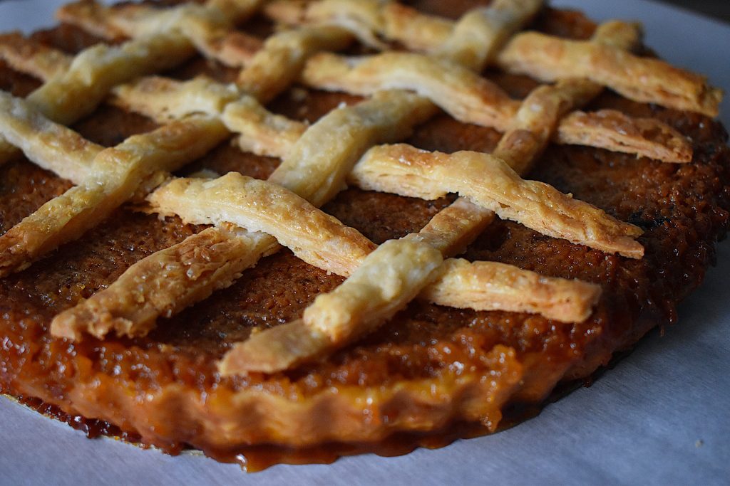 - Carefully move the baked lattice on to the top of the tart. Allow to cool before serving.